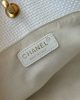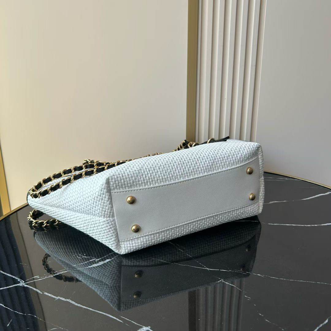 Woven canvas with straw texture, calfskin, and metal