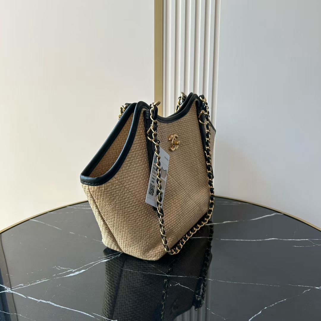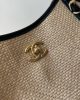 Woven canvas with straw texture, calfskin, and metal